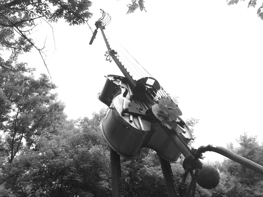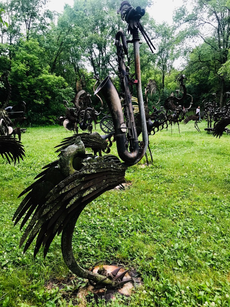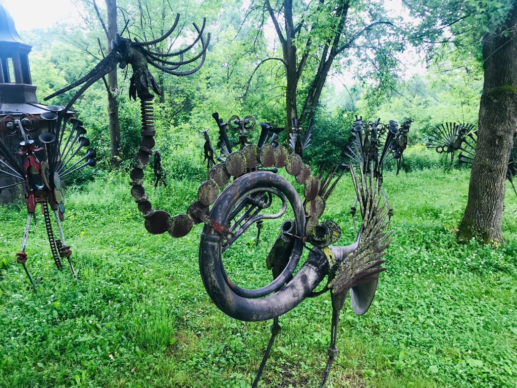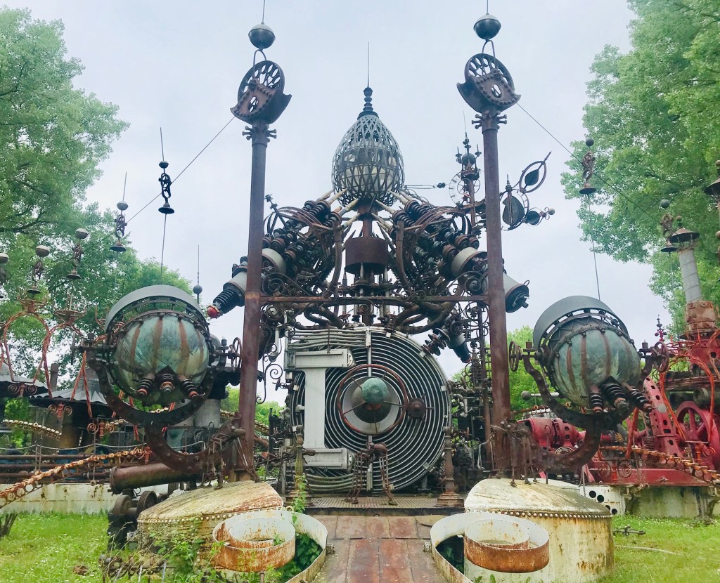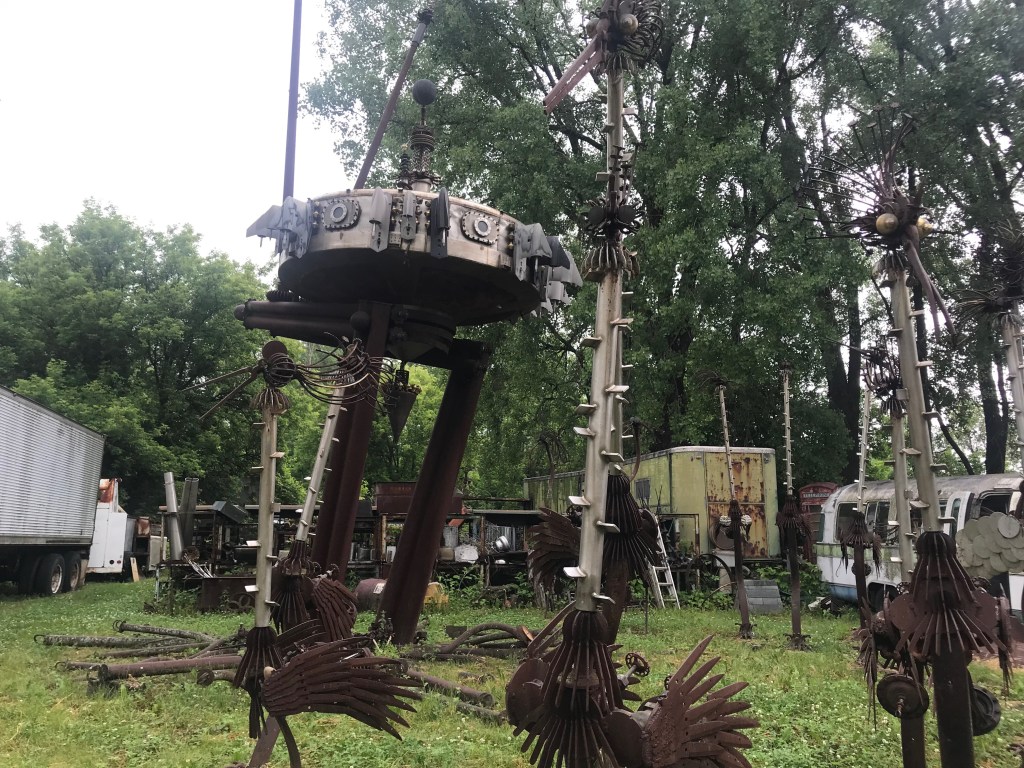 The only blueprint was in the mind of the now resting in slumber. A wild-eyed Doc Brown: Dr. Evermor, an outsider with a lot of whimsy and even more industrial scrap metal. Two 1880s Edison dynamos and lighting rods accentuate the piece above the seventy-member Bird Band Orchestra, The Epicurean, and gigantic insects like Juicer Bug and Arachna Artie.