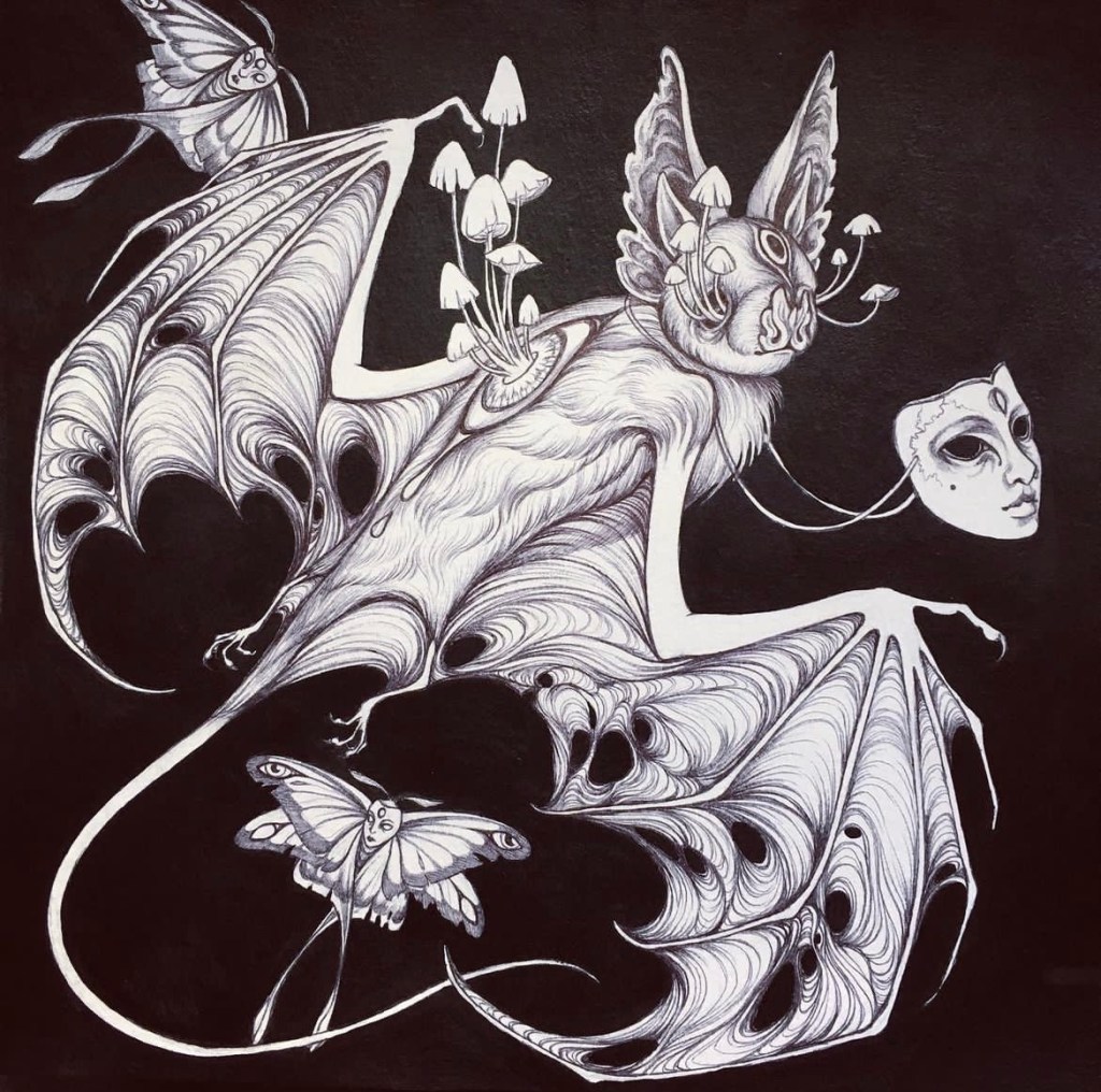 A few months later we were watching something on television and the third bat appeared out of nowhere, flying in the concentric circles of the Black Mass from the connected kitchen, spare room, and living room. Zipping through in a show of squeaking, chirping dominance, scaring the shit out of us. We sunk into the couch as our hearts sunk into our chests. A burning ghost of the Virgin Mary appeared before us as we then understood this was our dilemma. Our plague. We were haunted by fanged clairvoyants with superspeed.