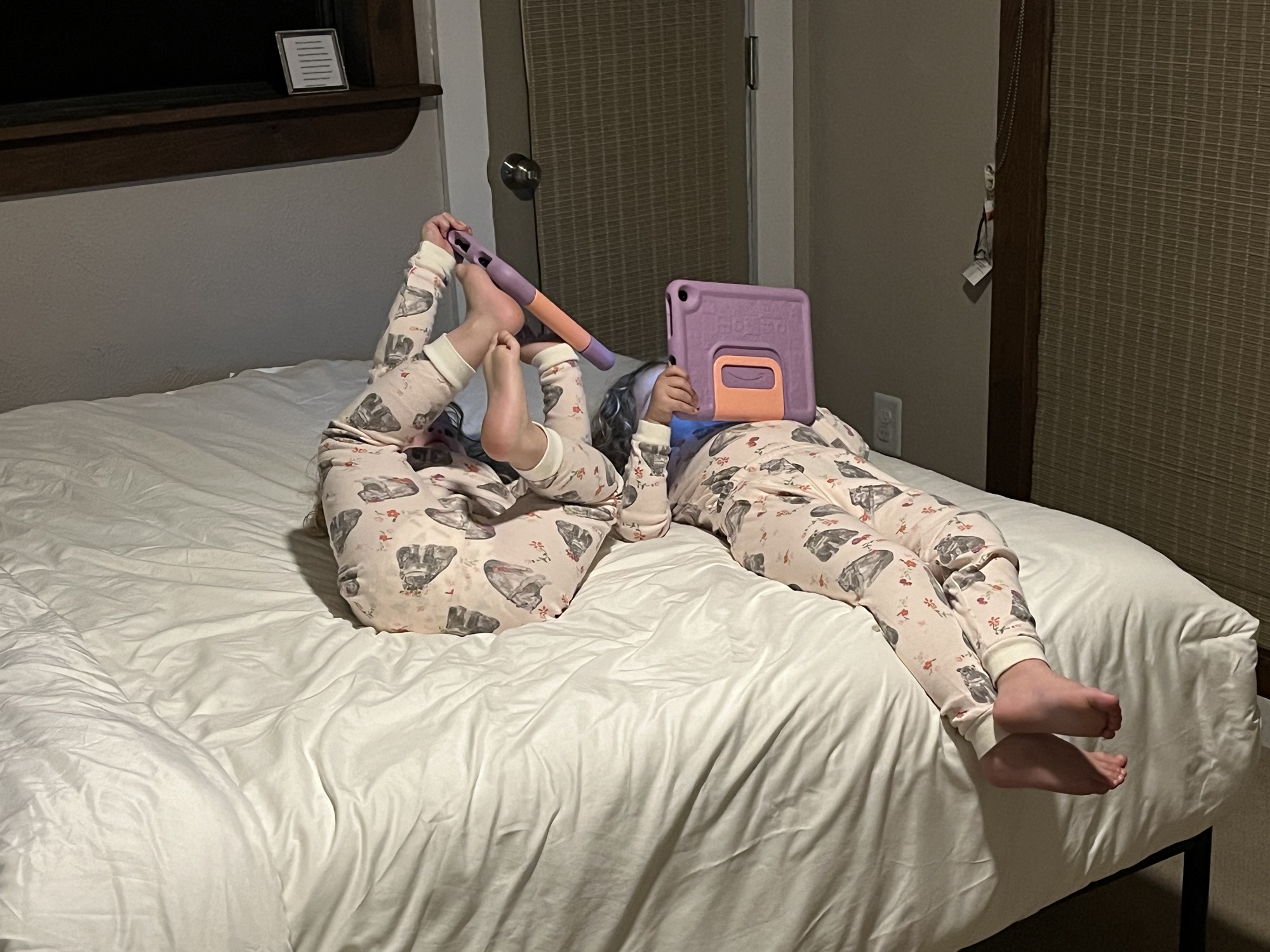 The second night in The Yellow Treehouse we decided to try out the notion have having both girls sleep in the same bed, while I lie perpendicular to them at the foot. They laid there watching their little pink iPad things. Sometimes they fall asleep while watching and sometimes they just watch for so long my parental guilt kicks in.