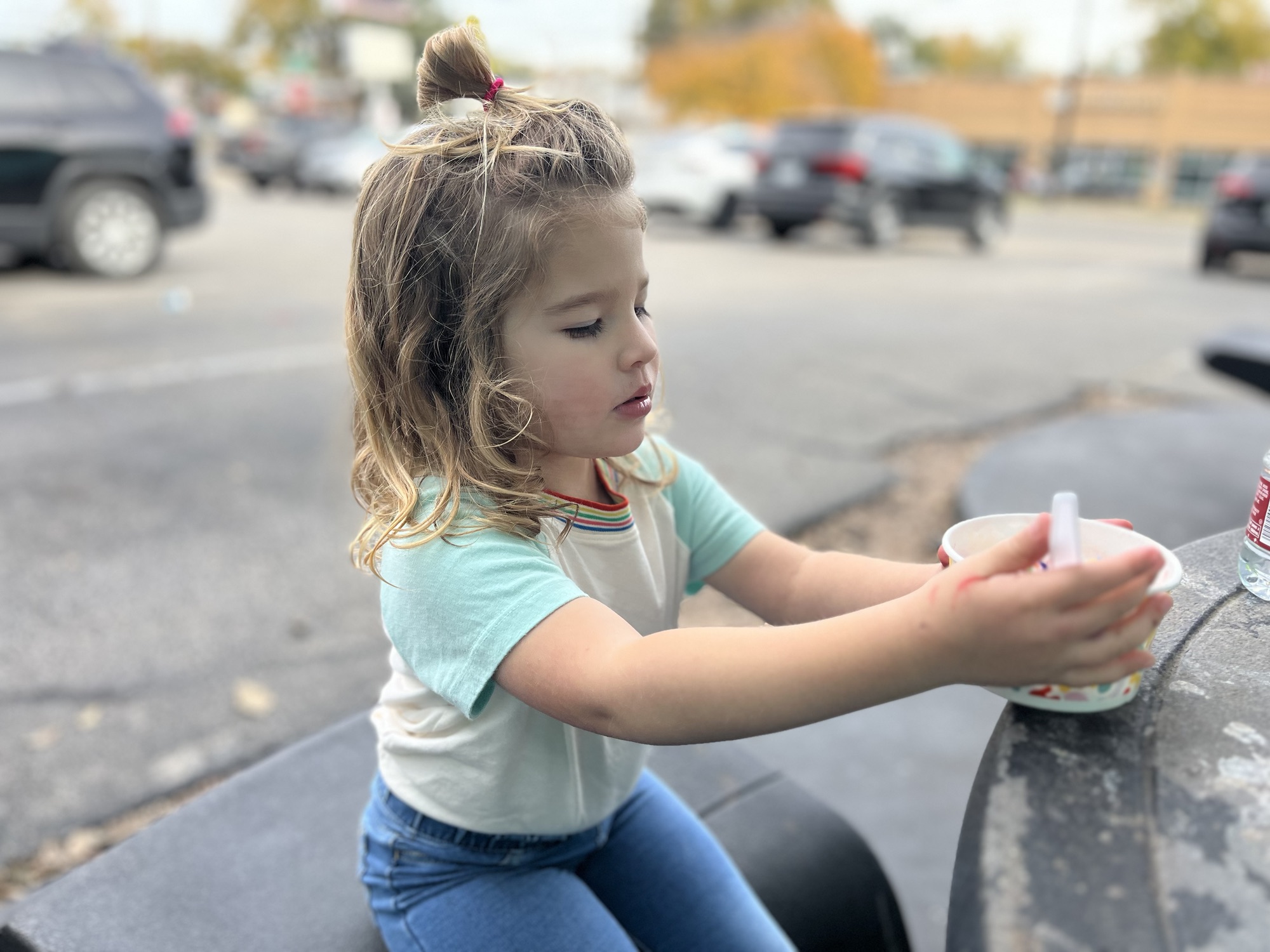 This particular visit to Old MacDonalds also spun to a potty break. We unbuckled our rental SUV car seat belts, screaming and whining all the while, about which car door we are going exit from as well as who gets to crawl our first and which baby stuffed animals we are bringing in. We shuffled into the fast-food chain.