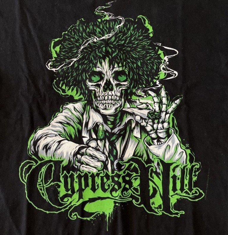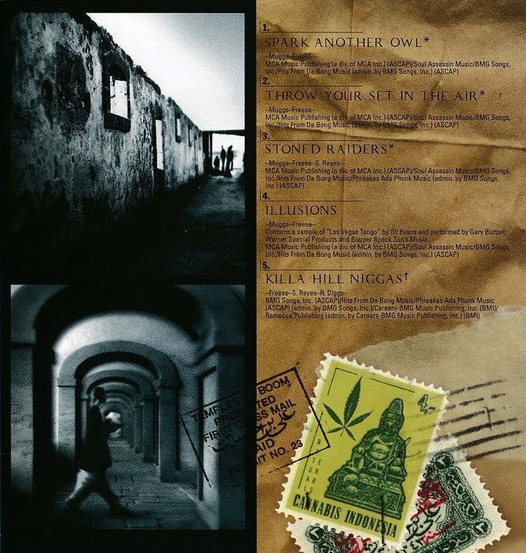 The liner note booklet showed relics and vintage stamps displaying marijuana leaves, and there was a photo of a sinister funk freaker – a vato loco with a pot leaf tattooed in the middle of his forehead. At the time I just assumed it was a photo of Sen Dog who must’ve undergone a large commitment to never again landing a real job.