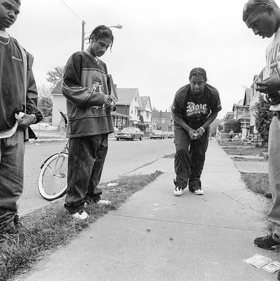 At some point they’re in a getaway car, probably driven by Wish Bone, and they run straight to a roadblock full of armed police. They swerve and reverse, pop the trunk and Flesh-n-Bone jumps out with two chrome plated Berettas, firing rounds at the coppers on some never-taken-alive shit.